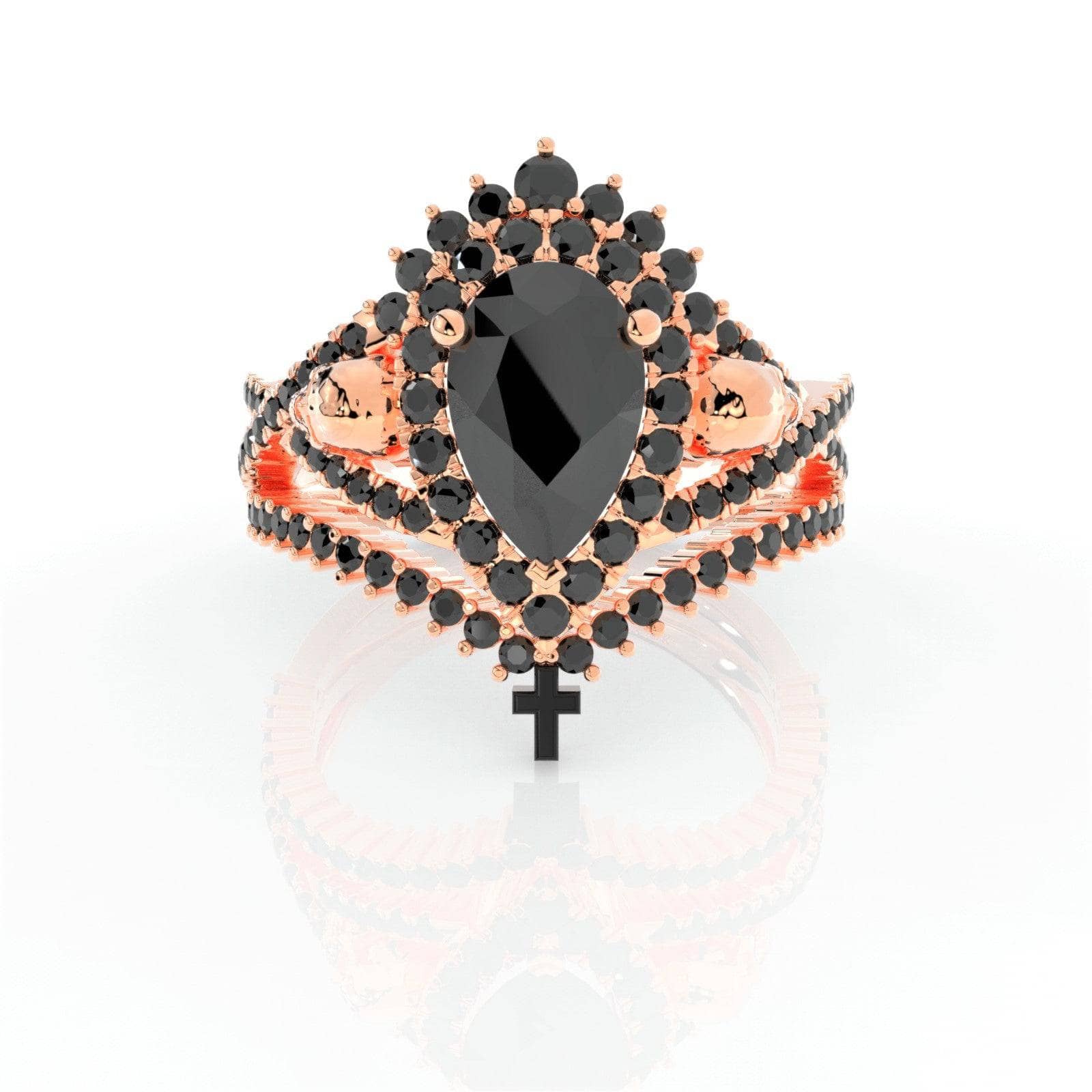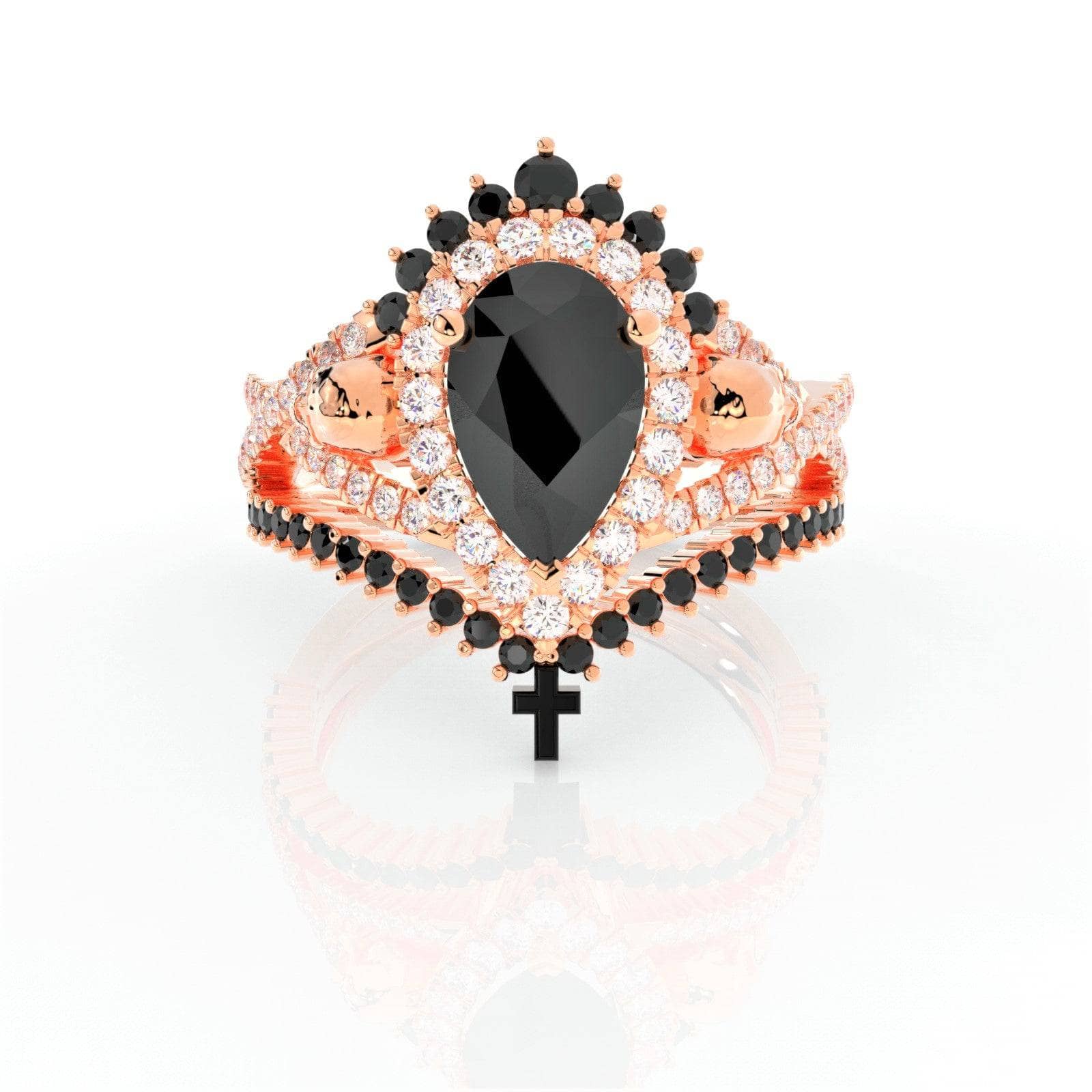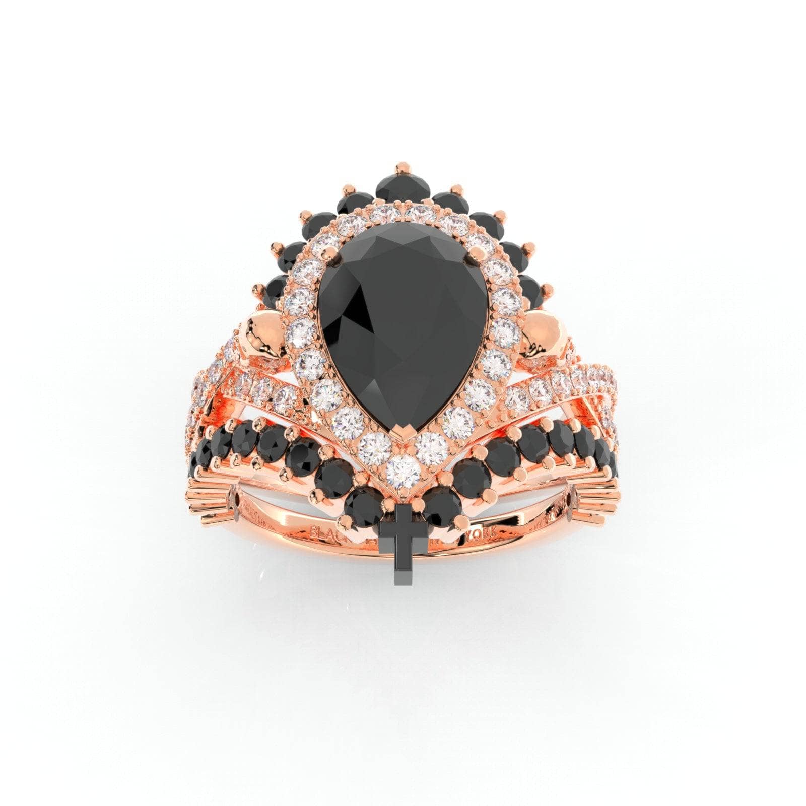 Loyalty Ring- 1ct Pear Cut Black Diamond Skull Ring Set