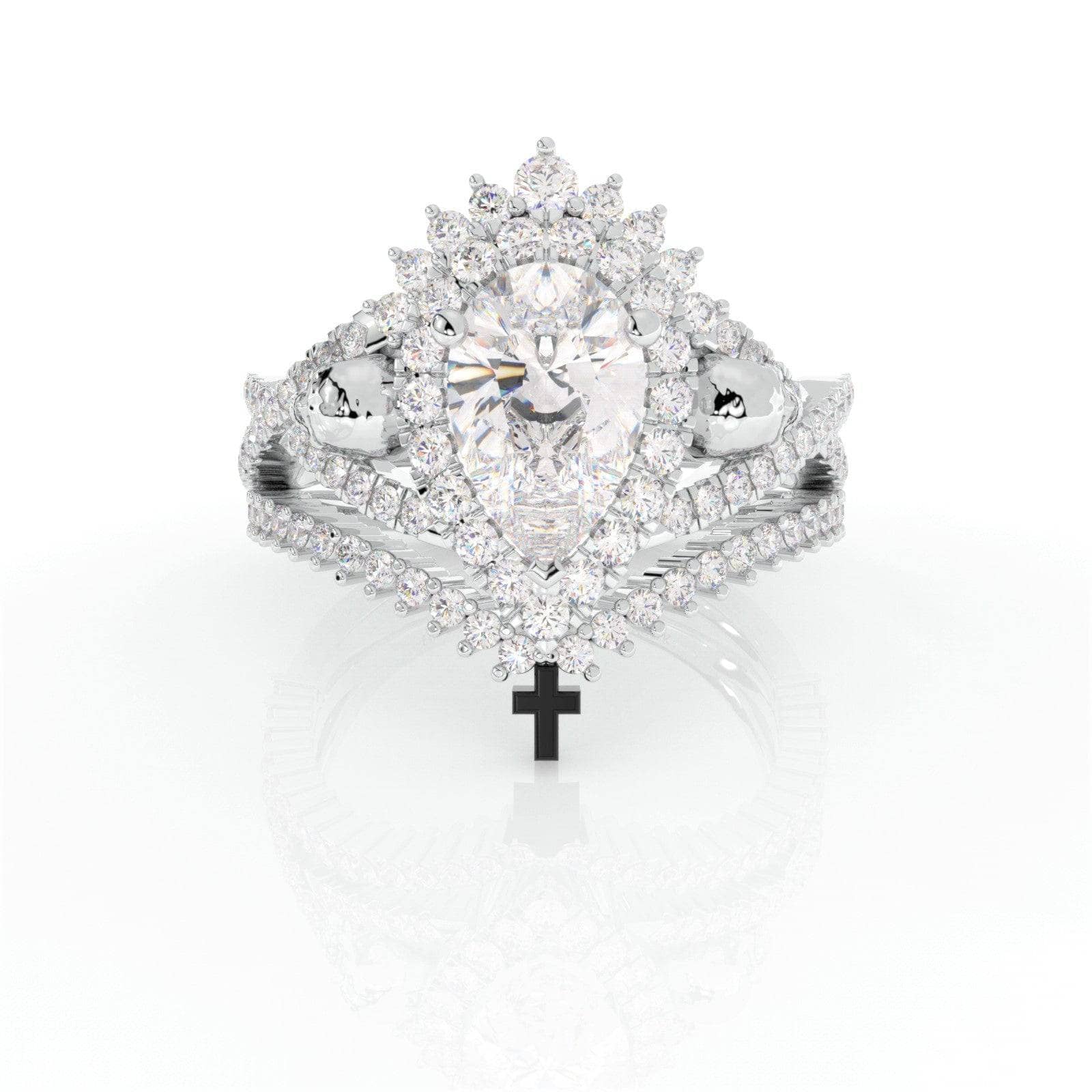 "Join me for eternity" Step into the world of elegance and commitment with the exquisite and captivating Loyalty Ring- 1ct Pear Cut Black Diamond Skull Ring Set by Black Diamonds New York. Meticulously crafted from 14K gold, adorned with a stunning Pear-shaped Round Cut stone and 0.39ct of brilliant diamonds in the color range of D-F and VVS1 clarity, this breathtaking set showcases two skulls guarding the center stone, a twisted band with rows of round cut diamonds, and an enchanting cross as a ring enhancer. Let this extraordinary piece embody your unbreakable loyalty and convey your boundless love to your beloved.
