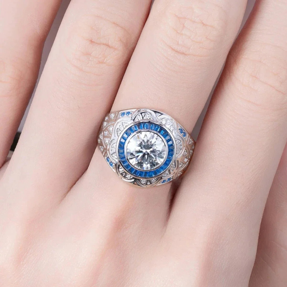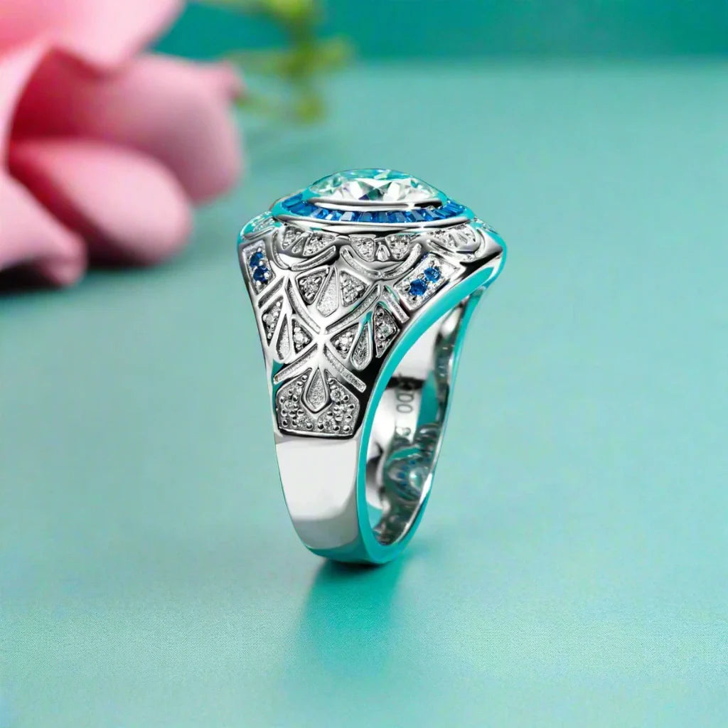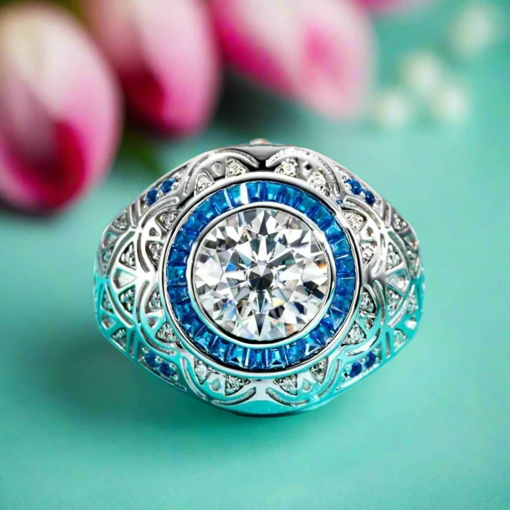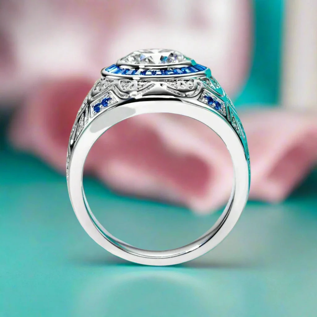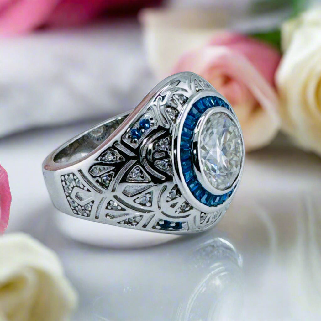Be swept away by the timeless allure and contemporary radiance of our 3.0 Ct Certified Moissanite Vintage Men's Engagement Ring by Black Diamonds New York. Comfortably fit into your finger, its 9mm round cut stone captivates with 3 resplendent carats of splendor. An exquisite blue stone-encrusted vintage-style setting provides an exquisite and mesmerizing addition to the classic design. Crafted with the highest caliber 925 Silver, dipped 5x in 18k white gold, this piece of jewelry adds a touch of luxury to your big day without compromising affordability. Adorn this beautiful ring and let it symbolize your undying commitment.