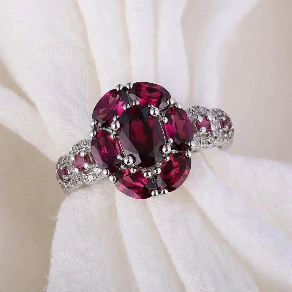 Elevate your elegance with this captivating ring, designed to turn heads and make a statement. Crafted from 925 sterling silver with white gold accents, this elegant ring showcases a vibrant 3.0-carat natural purple garnet in an oval shape. Adorned with sparkling created diamonds and a delicate flower design, it offers timeless beauty in every detail.
