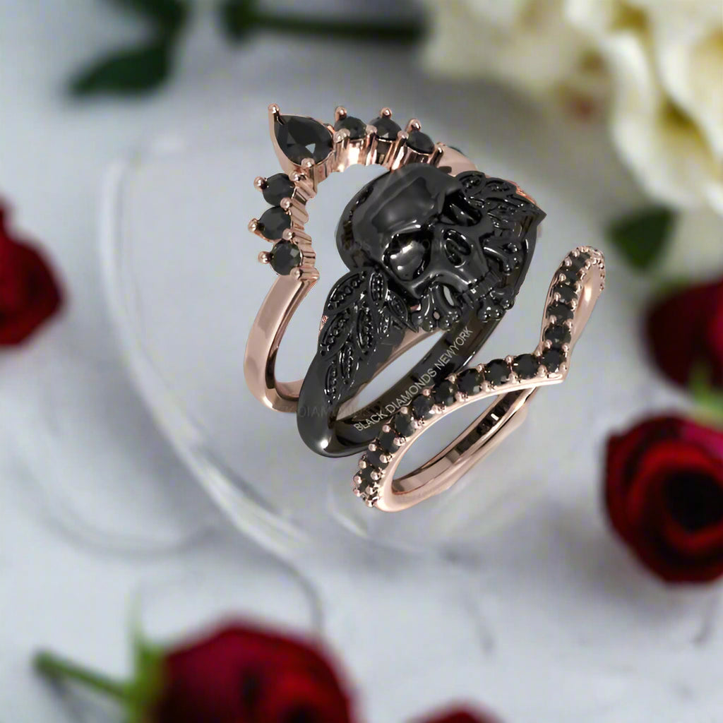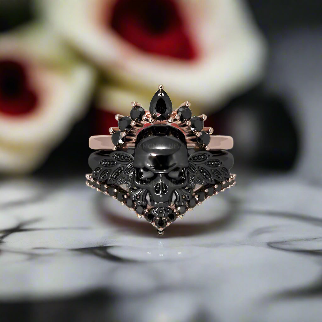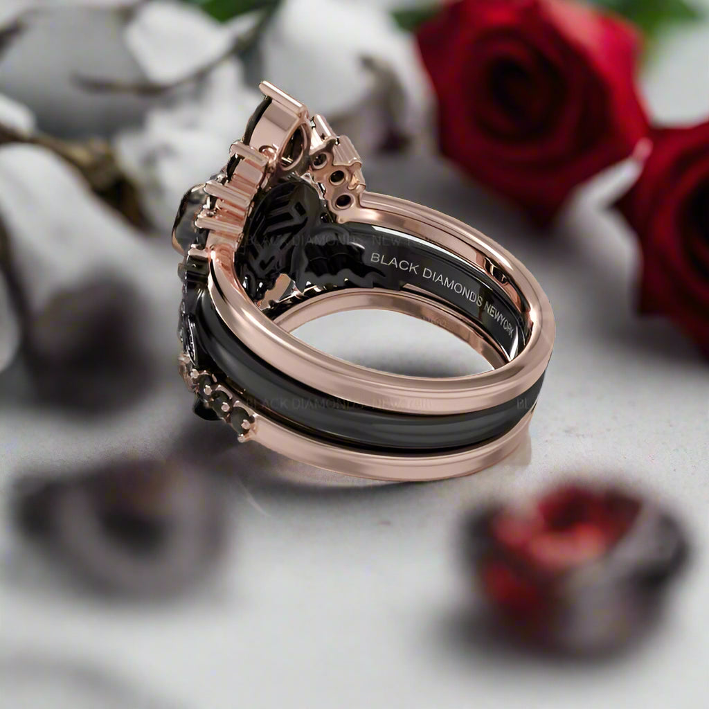 Discover the grandeur of My Queen- the epitome of Black Diamonds fashion, designed for true Queens. This exclusive and exquisite 3-piece wedding ring set features a 14K rose gold band with a black rhodium overlay, adorned with round and pear-cut diamonds to enhance its elegance. The intricate skull design serves as the centerpiece, accompanied by delightful enhancers that symbolize the coronation of your beloved Queen. Experience the allure, enigma, and prestige of this luxurious set- "I crown you, the queen of my heart!"
