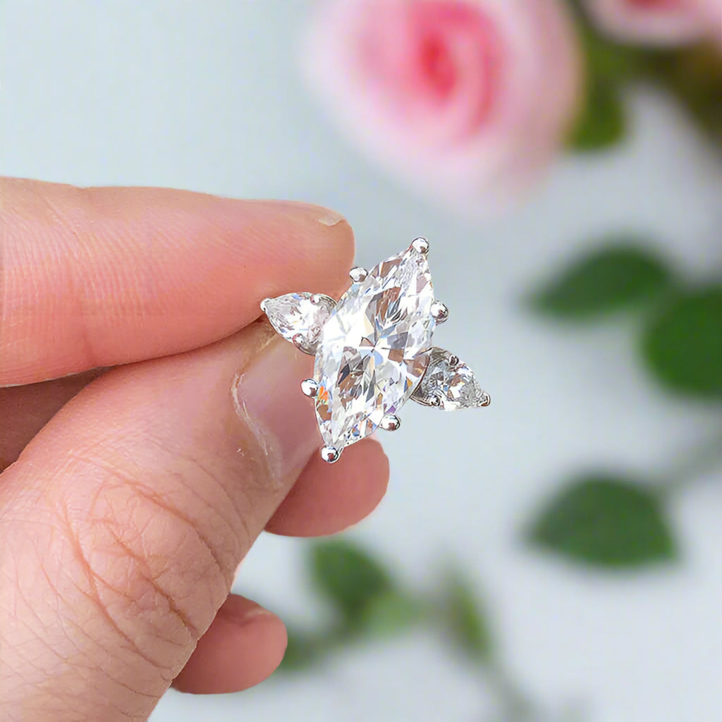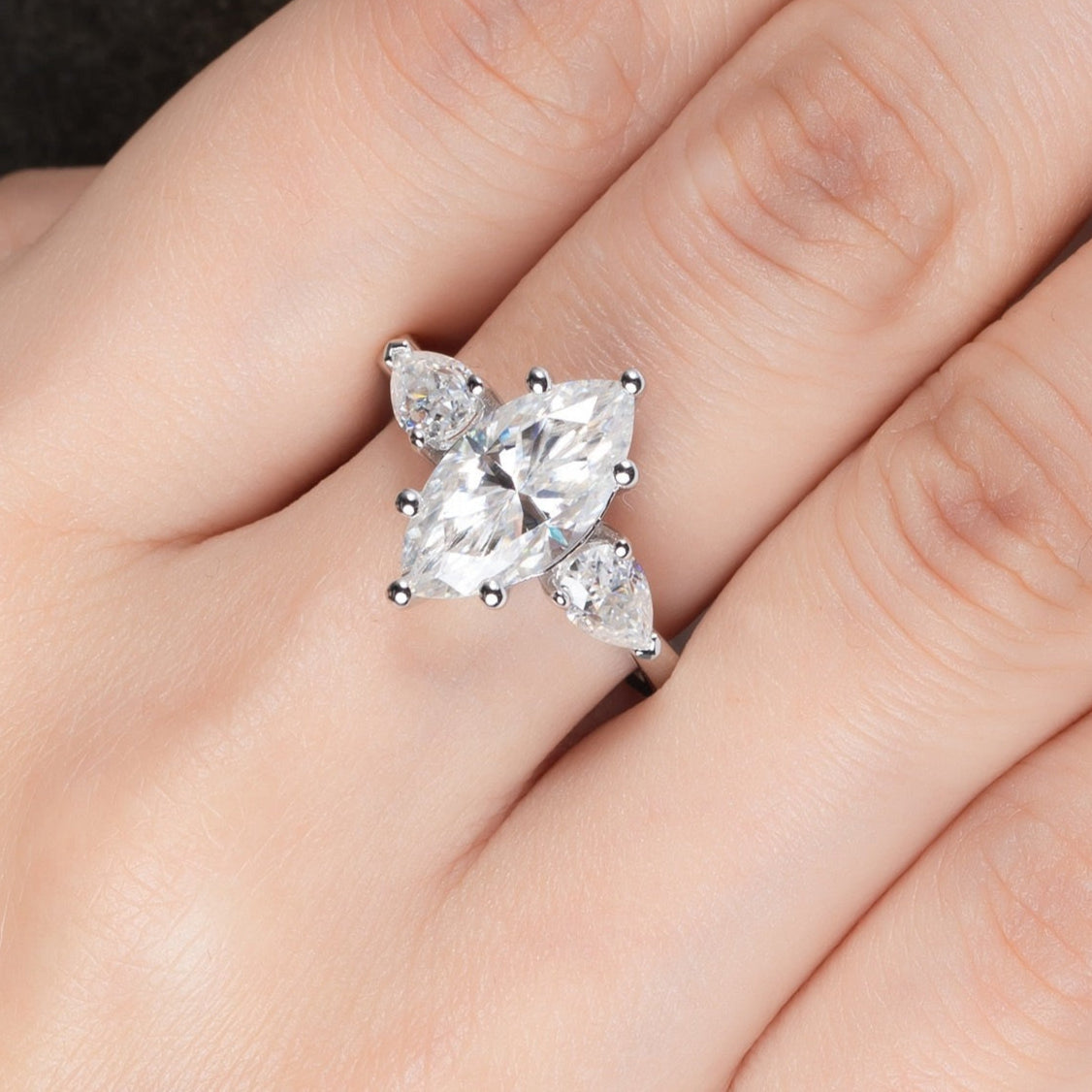 Elevate your proposal game with our 4.0 Ctw Marquise & Pear Cut Certified Moissanite Diamond Engagement ring! The stunning marquise cut creates the illusion of a larger stone, while the sparkly moissanite is a beautiful alternative to diamonds. The prong setting securely holds the stone in place, and the three-stone design gives this ring a classic yet modern look. Elegant and timeless, this ring is sure to make your special moment unforgettable.