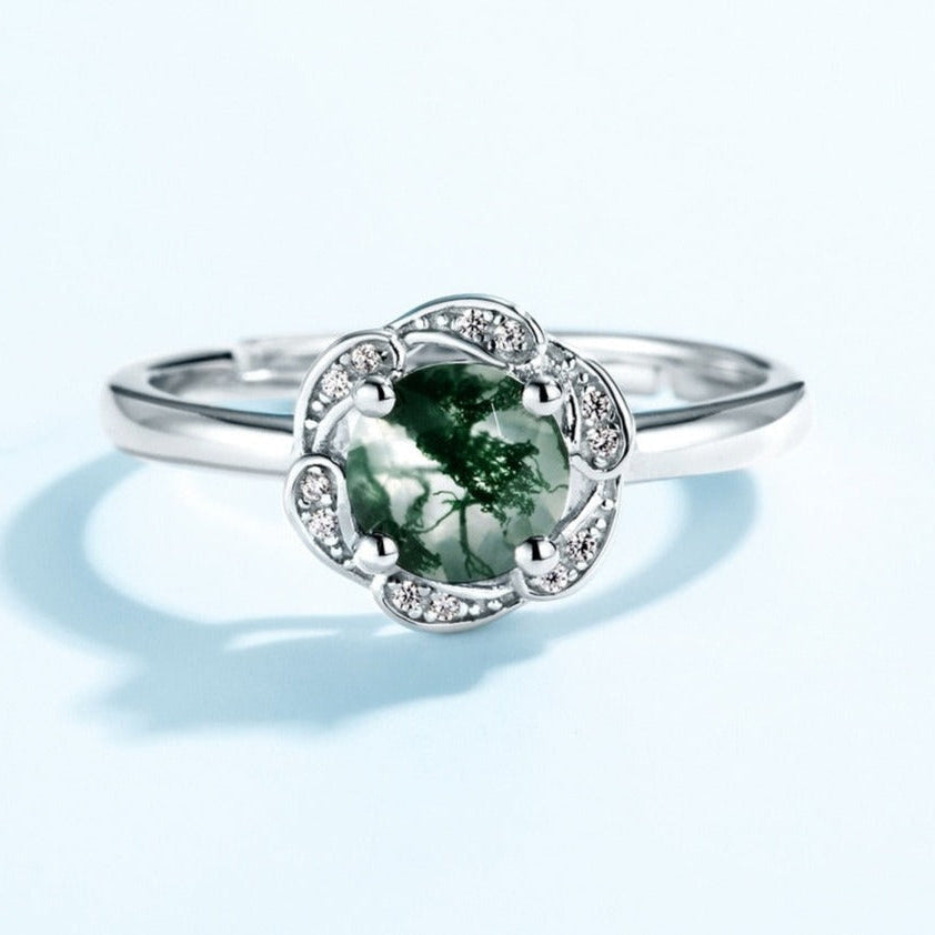 Treat yourself or your loved one to our stunning 6*6mm Natural Moss Agate Engagement Ring! The round cut Moss Agate stone in this ring is simply breathtaking, and is sure to be a conversation starter anywhere you go. The prong setting ensures that the stone is held securely in place, while the delicate flower design adds a touch of elegance and sophistication. This ring is perfect for anyone looking to make a statement with their engagement jewelry, and is crafted to last a lifetime.