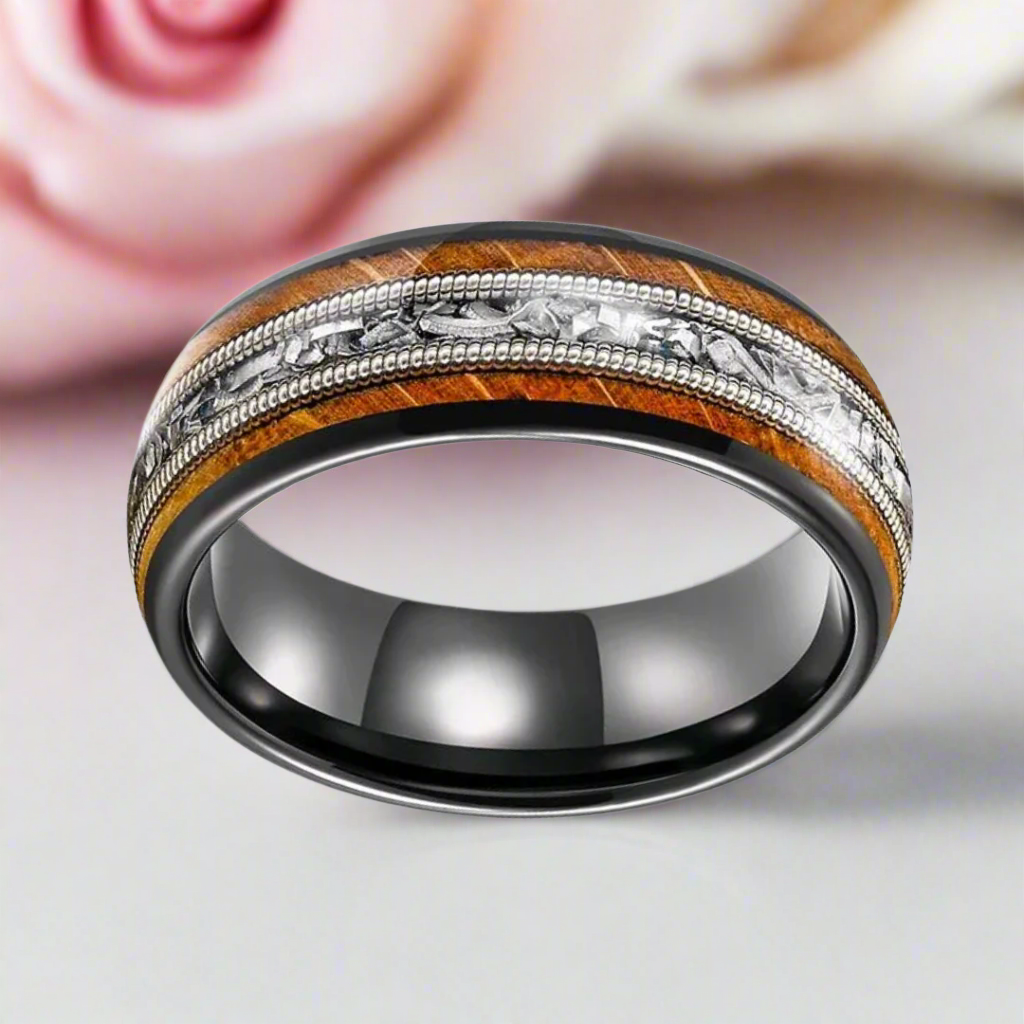 Experience the unique blend of tradition and artistry with our 8mm Tungsten Carbide ring, featuring a stunning inlay of Whiskey Barrel Wood and Guitar Strings. Crafted to perfection, this ring is the perfect accessory for those who appreciate both style and substance. Add a touch of craftsmanship and sophistication to your ensemble with our one-of-a-kind ring.