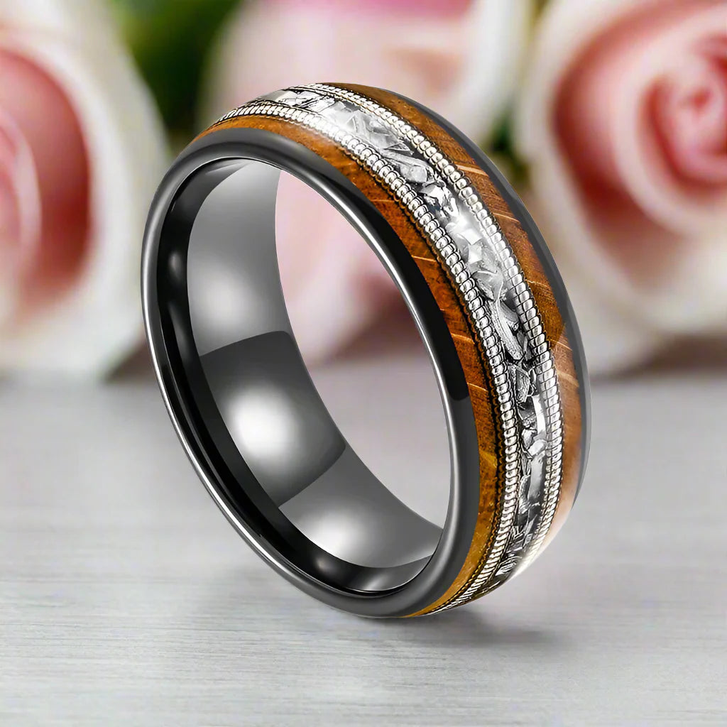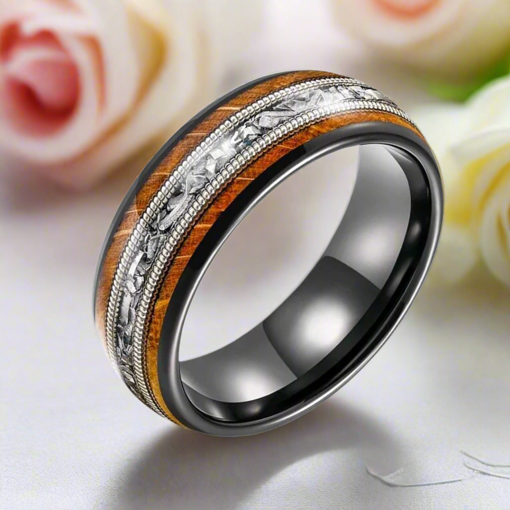 Whiskey Barrel Wood and Guitar Strings Inlay Tungsten Carbide Ring