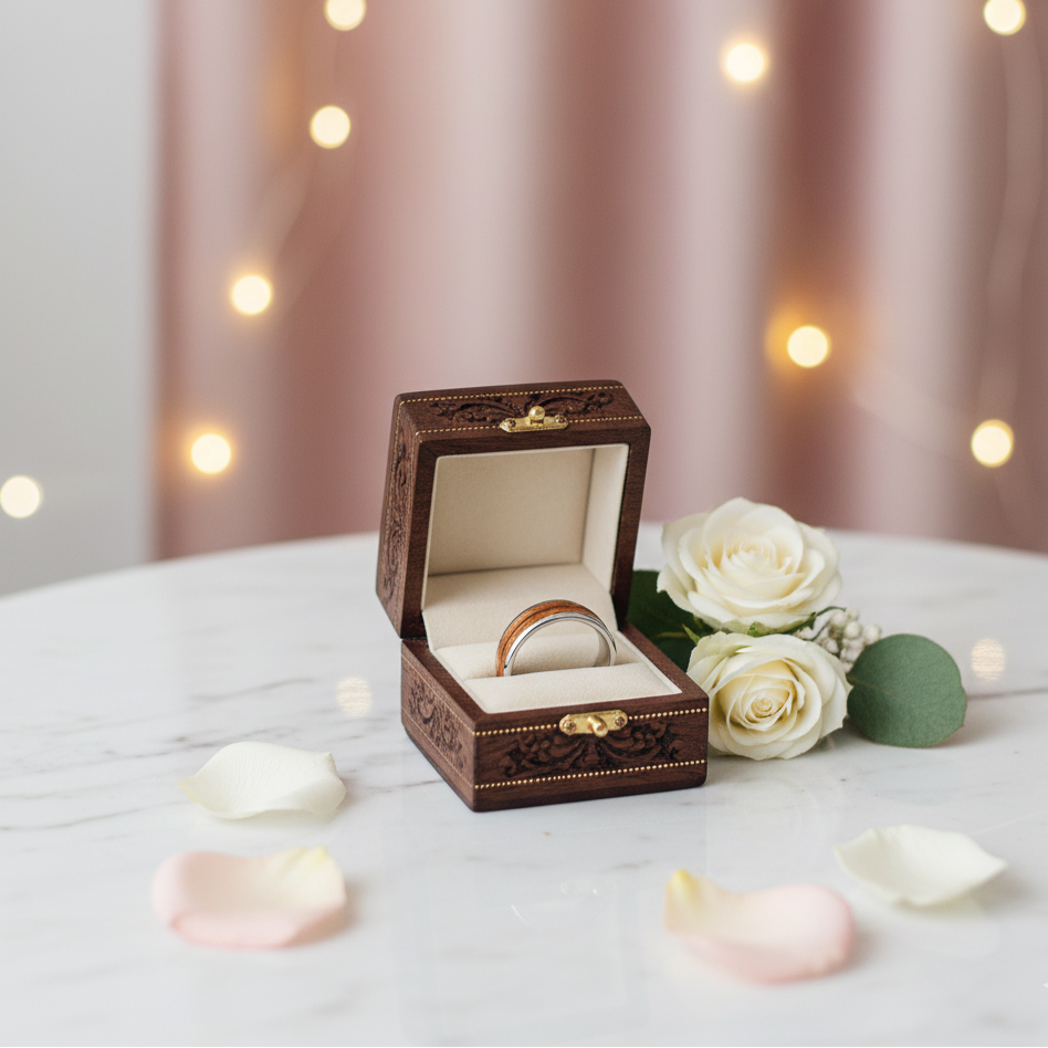 Crafted from high-quality Tungsten, this men's wedding band features a unique design incorporating wood and guitar string elements. The durable metal construction adds to the overall strength and sleek 8mm surface width of this ring, making it a perfect choice for any groom.